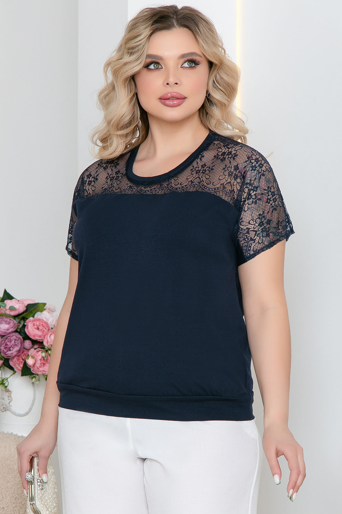 Блуза с акцентным передом и с цельнокроеным рукавом, украшенными гипюром. Отлично смотрится как с брюками, создавая деловой стиль, так и с джинсами. Идеально подходит для повседневной жизни.