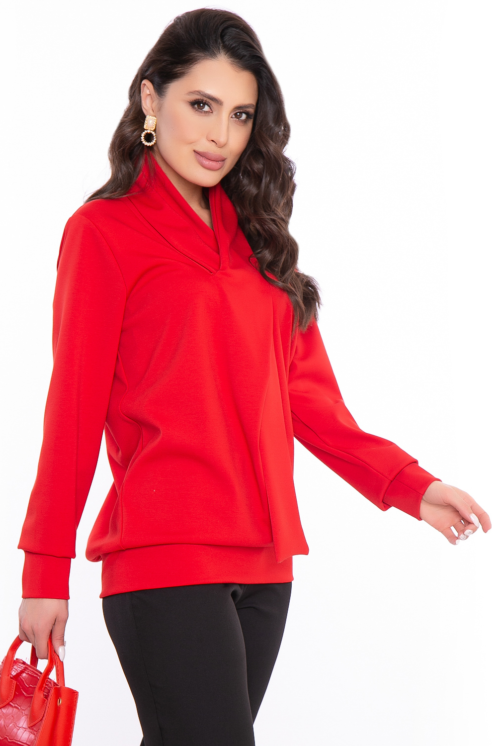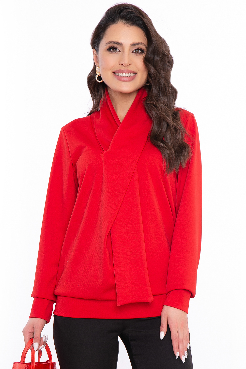 Дизайнерский джемпер с воротником-шарфом в шикарном ярком-алом оттенке, притягивающем взгляды. Он однозначно внесет стильный акцент в Ваш повседневный гардероб.