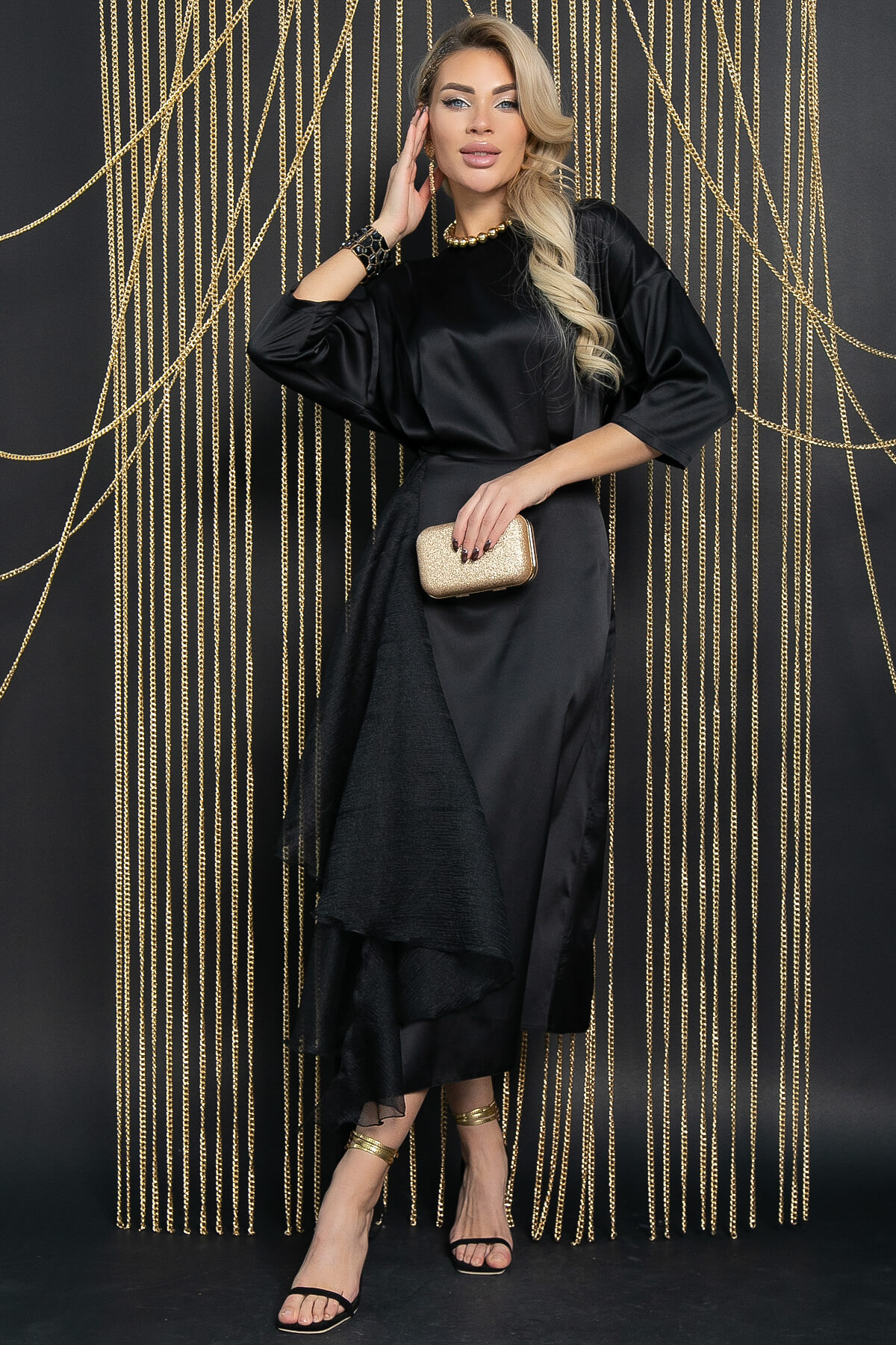 Изысканное платье в макси-длине – идеальный выбор для любого торжества. Платье с рукавом-регланом, выполненное из качественного атласа, мягко облегает фигуру, подчеркивая её достоинства. Акцентной деталью является юбка, которая декорирована хвостом из органзы, что придает ему особую воздушность и шарм. Платье отрезное по талии.