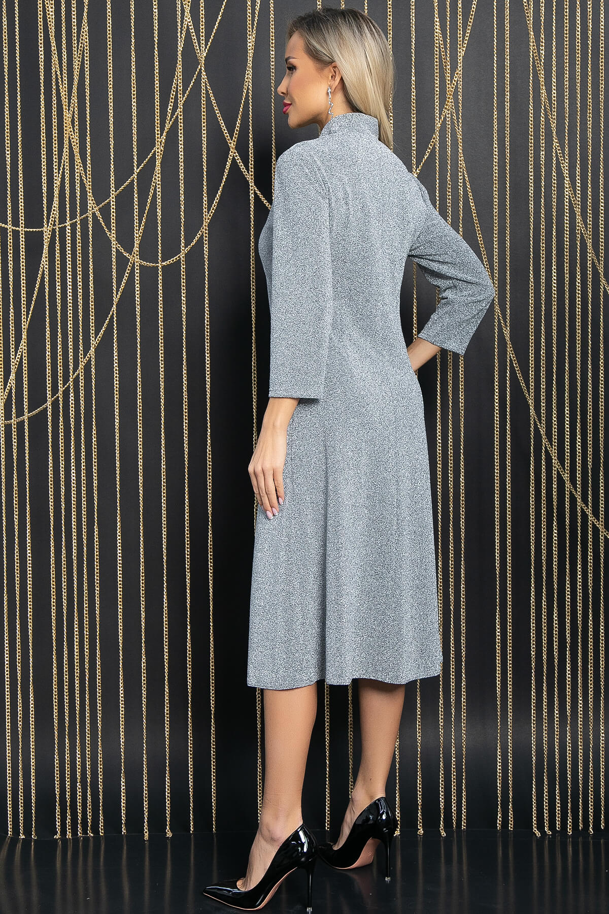 Неповторимый образ гарантирован! Невероятно яркий серебряный оттенок выглядит стильно и женственно! Воротник на стойке переходит в разрез к линии груди. Рукав втачной, три четверти. По низу изделия разрез, который придаст образу игривости. В комплект входит пояс из основной ткани с декоративной пряжкой, который подчеркнет все преимущества фигуры.