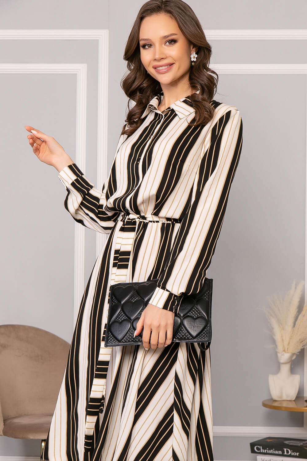 Тренд сезона 2023 года - стильное элегантное платье-рубашка. Такая модель подойдёт как для создания делового, так и повседневного образа. Подобрать аксессуары можно легко, всё зависит от вашего настроения и ситуации. В классическом варианте платье отлично выглядит с туфлями на каблуке, но в более тёплый период. Пояс из основной ткани входит в комплект. Благодаря летящей юбке такая модель платья выглядит очень женственно и элегантно. Кстати, такое платье обязательно стоит взять с собой отпуск! Оно неприхотливо в выборе аксессуаров и может быть использовано и в качестве нарядного и в качестве повседневного образа.