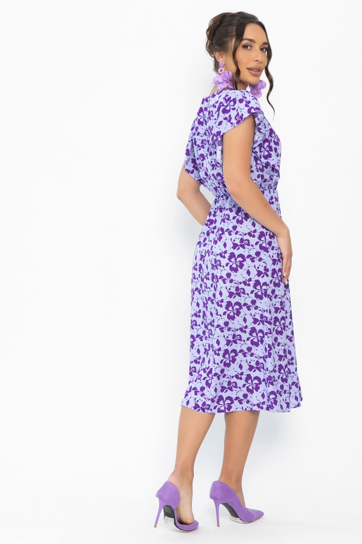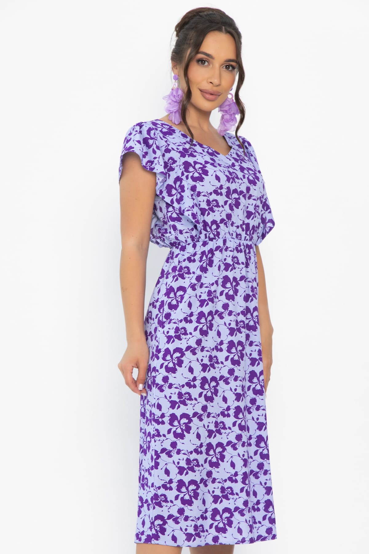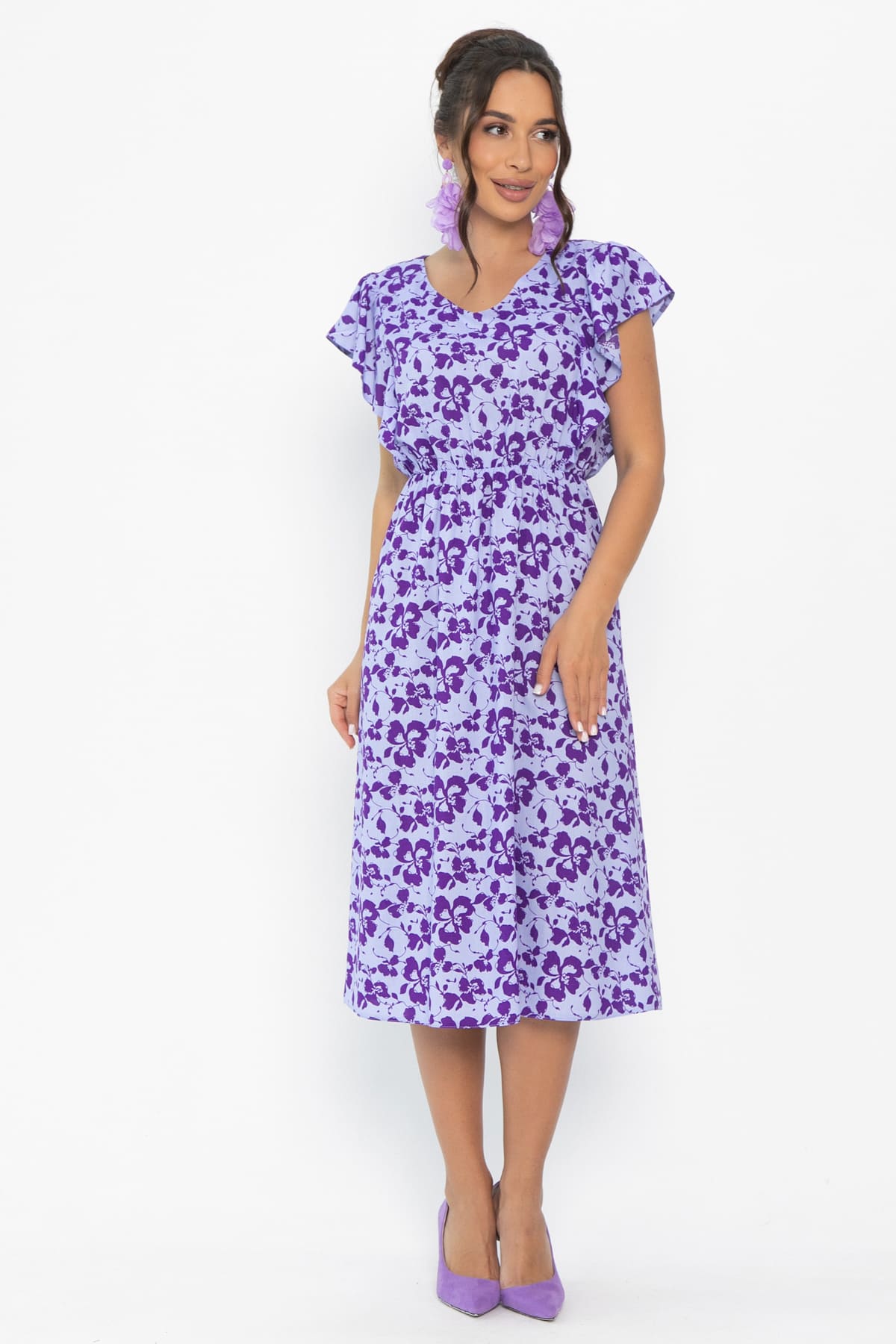 Очаровательное платье идеально подойдет для летних дней и теплых вечеров. У платья голубой фон и фиолетовые цветы, что создает интересную игру цвета и при разном освещении оно приобретает чуть более сиреневый, а иногда более синий оттенок. Его приталенный крой и женственные детали подчеркивают индивидуальность, создавая ощущение комфорта. V-образный вырез акцентирует внимание на шее, а рукава-крылышки добавляют образу легкости и романтики. Резинка по талии подчеркивает фигуру. Юбка А-силуэта создает женственный и изящный силуэт. Это универсальное платье, которое подчеркнет вашу уникальность и добавит элегантности в любой образ.
